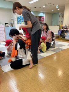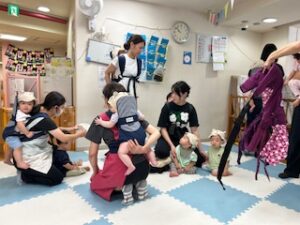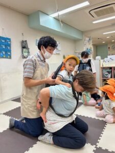 保育園でのおんぶは二人一組でします。