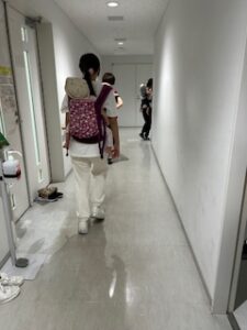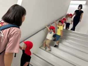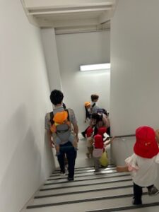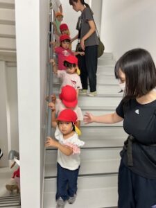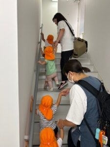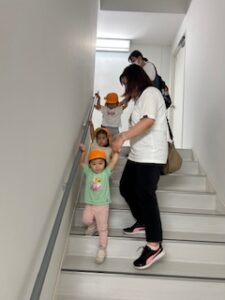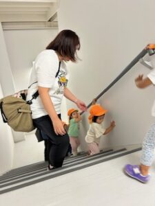 貢献施設棟とは言え保育園専用の建物ではないので、階段の段差や手すりの高さは大人使用になっています。そのため、1歳児さんは身長と足の長さが足りず、両手で手すりにつかまったり壁に手を添えたりとさながらアスレチックにでも挑戦しているかのようでした。