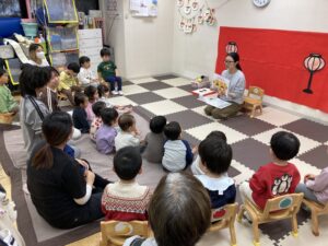 司会者が0歳児さんにもわかりやすいように『ひな祭り』のお話をします。