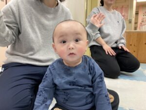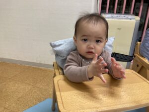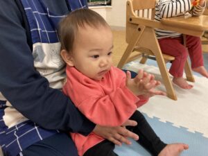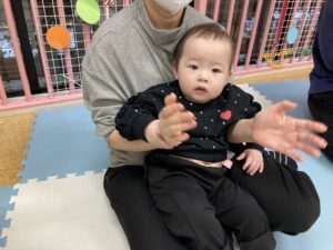 可愛い手のひらをパーにして、保育者の真似をしながらお歌もうたっています。